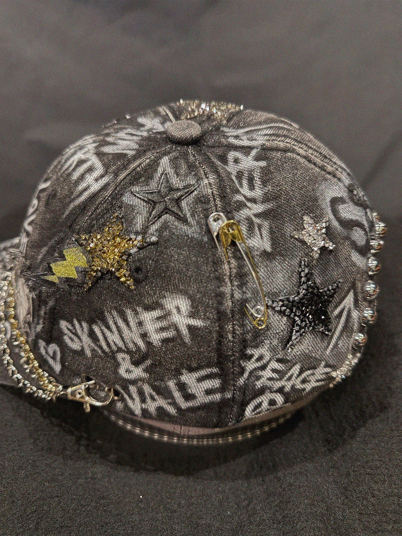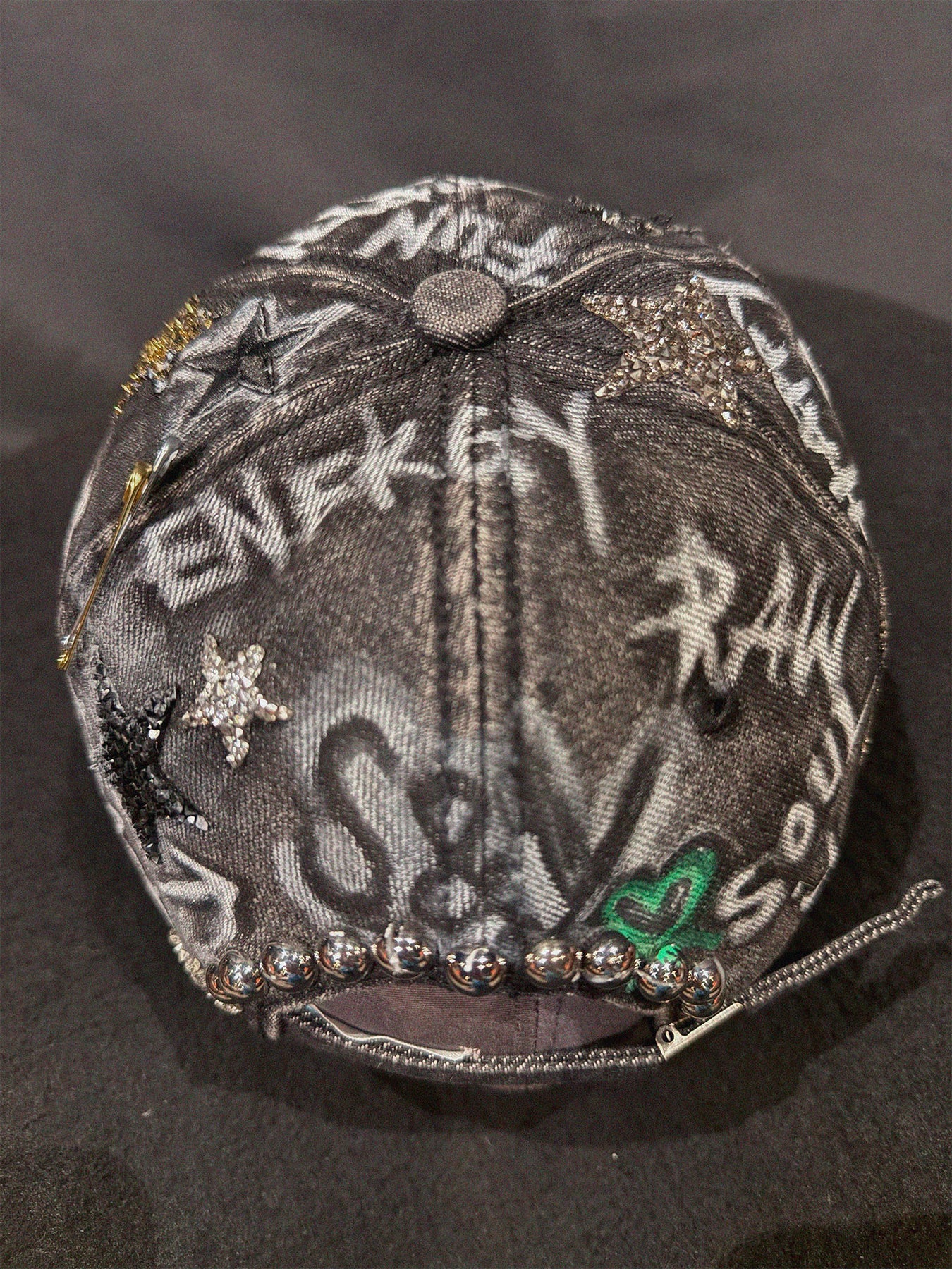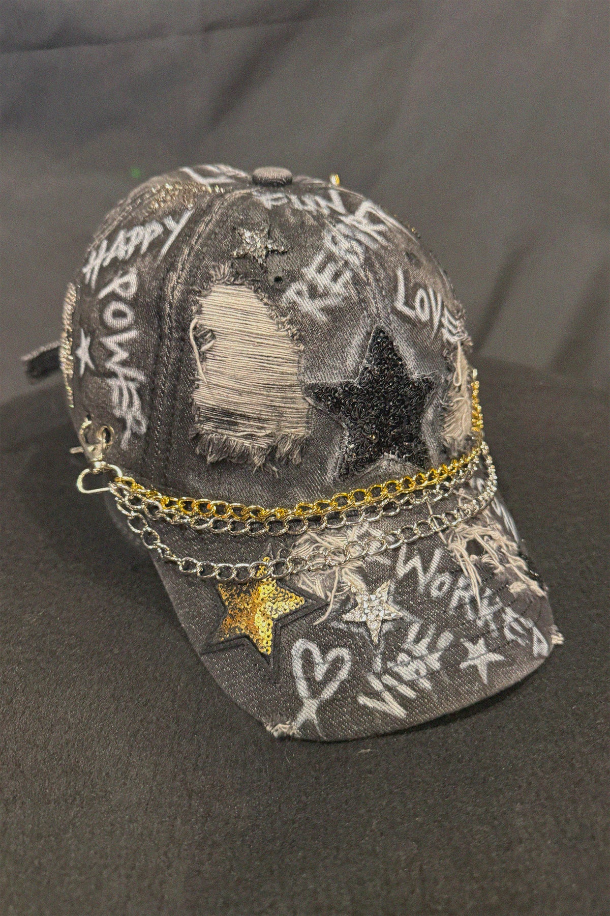 Customisation FormUpcycled black distressed denim cap.