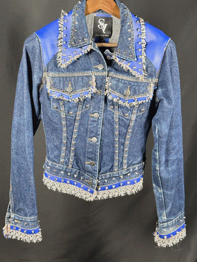 Classic up-cycled Denim Jacket with blue, orange, white, and black tweed and royal blue vegan leather up-cycled fabric.