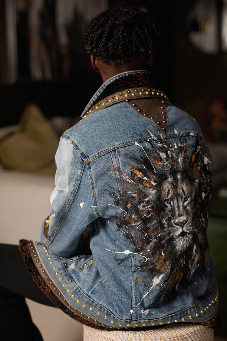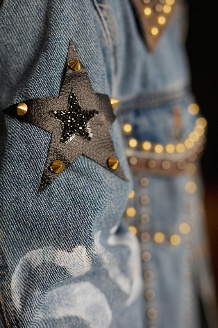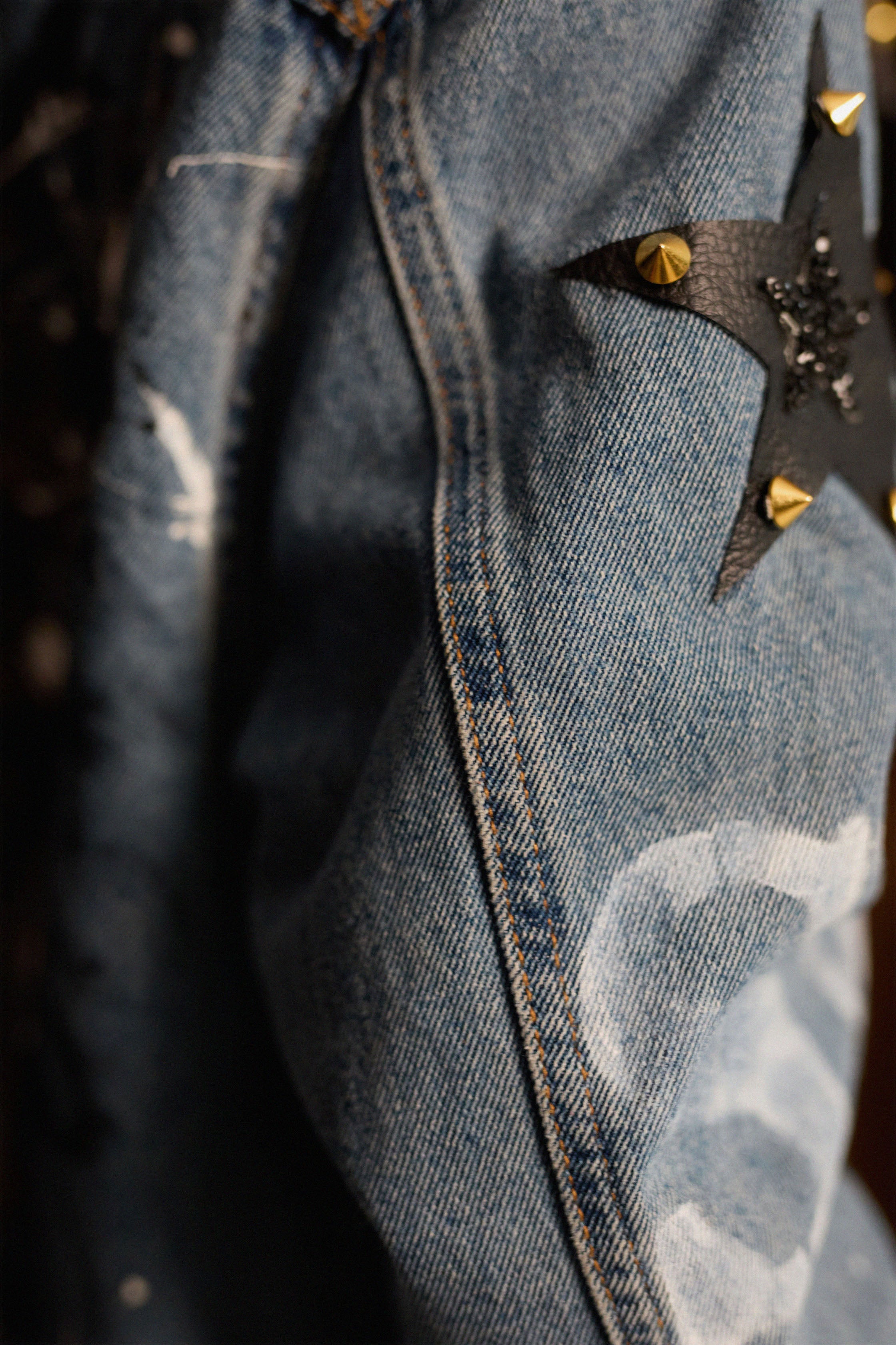 Material Composition: Denim with studs, Vegan leather, Acrylic paint, Badges/patches. Dry clean only.